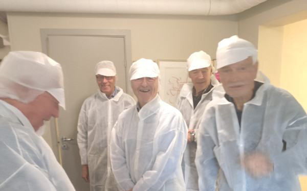 Til slutt tok Bjørn Furuhaug med oss gjennom produksjonslokalene. Her måtte vi kle oss i hvite kapper, luer og skohetter. Strengt regime på renslighet. Stor grad av automatikk. Egne maskinteknikker som tar seg av vedlikehold og reparasjoner. Renhold av maskinene er det operatørene som gjør. Anne takket for et interessant besøk og overrakte Bjørn en vinflaske.