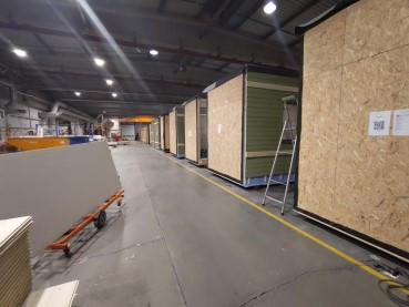 Modulene settes sammen nærmest som på samlebånd. På bildet er det moduler til Forsvarsbygg på rekke og rad. De som står nærmest utgangen er kommet lengst i